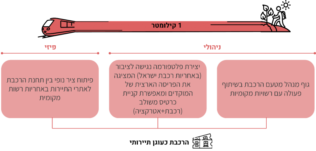 4. יצירת פלטפורמה – השלב האחרון בתהליך כולל את הקמתה של פלטפורמה דיגיטלית ארצית, בהובלת הגוף המנהל ובשיתוף אתר רכבת ישראל. פלטפורמה זו תשמש כלי מידע, ניווט ושיווק – ותציג את הפריסה הארצית של מוקדי התיירות הקשורים לתחנות הרכבת. בנוסף, היא תאפשר רכישת כרטיס משולב לתחבורה ציבורית ולאטרקציות. הפלטפורמה תהווה אמצעי משמעותי להנגשת המידע לציבור הרחב, תעודד תיירות פנים, ותחזק את תחנות הרכבת כשערים פעילים לעולם התרבות, הפנאי והטבע העירוני.