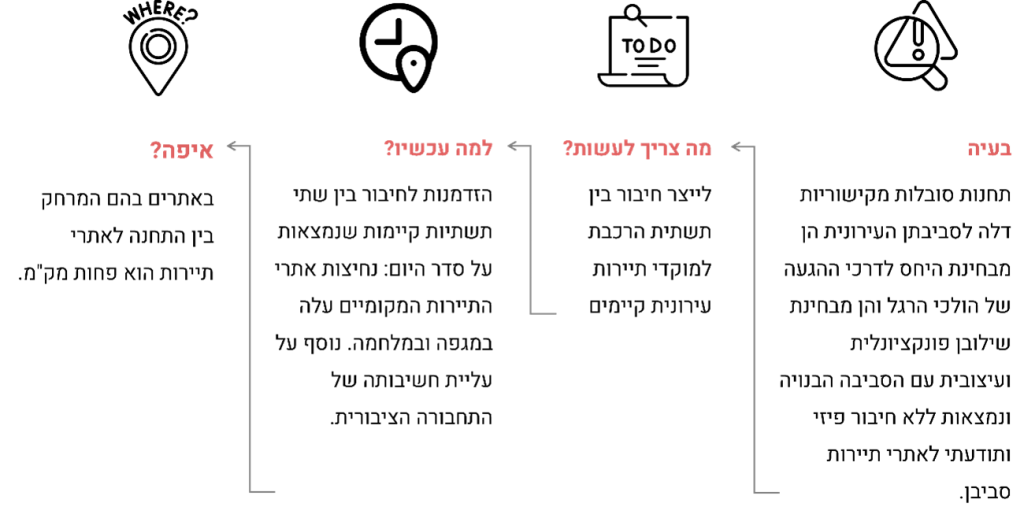 תחנות רכבת בישראל מתפקדות בעיקר כאתרי תשתית תחבורתית, תוך ניתוק מהמרחב העירוני הסובב אותן. התחנות מוקפות בחניונים, דרכים ראשיות ובתכנון הליכתי חסר. כתוצאה מכך, תחנות הרכבת אינן שערים עירוניים אלא איי תחבורה מנותקים, הפועלים בצורה אוטונומית בערים ובשכונות במקום להוות חלק אינטגרלי ומחולל בהן. מצב זה אינו גזירת גורל, הוא תוצאה של היעדר מדיניות אינטגרטיבית. ניתן וצריך להפוך את תחנות הרכבת למוקדים עירוניים, באמצעות חיבור בין שתי תשתיות קיימות: תחנות הרכבת ומוקדי תיירות עירוניים המצויים במרחק הליכה של עד קילומטר. כיום, תחנות רכבת רבות ממוקמות בסמיכות לאתרי תיירות עירוניים אך מנותקים. מצבים אלו, יוצרים נתק מהעיר, חווית משתמש חסרה והתעלמות מפוטנציאל כלכלי-תיירות עבור העיר. במקביל, מוקדי תיירות עירוניים מתפקדים פעמים רבות בחצר האחורית של התחנות ללא קישור או דרך הגעה נוחה. בכך הפוטנציאל לקשר נותר לא ממומש.