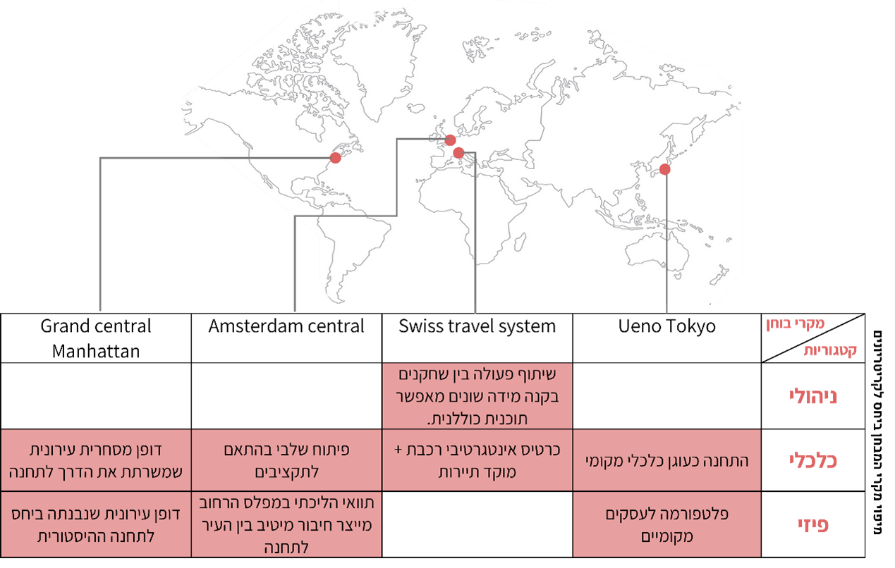 במהלך גיבוש המדיניות המוצעת נלמדו מקרים שונים מן העולם המדגימים פעולות בתחומים ניהוליים, תכנוניים וכלכליים בין תחנות הרכבת לבין סביבתן העירונית והתיירותית. הדוגמאות משקפות מודלים יישומים החל במדיניות לאומית מקיפה וכלה בתכנון מפורט למרחב התחנה וסביבתה. ההתייחסות למקרים השונים נעשתה באמצעות שלוש קטגוריות: ניהולי- בוחן את התיאום בין השחקנים; כלכלי- תפקוד התחנה כמנוע כלכלי; פיזי- איכות הממשק בין התחנה לעיר. להלן סקירה קצרה של דוגמאות מן העולם: