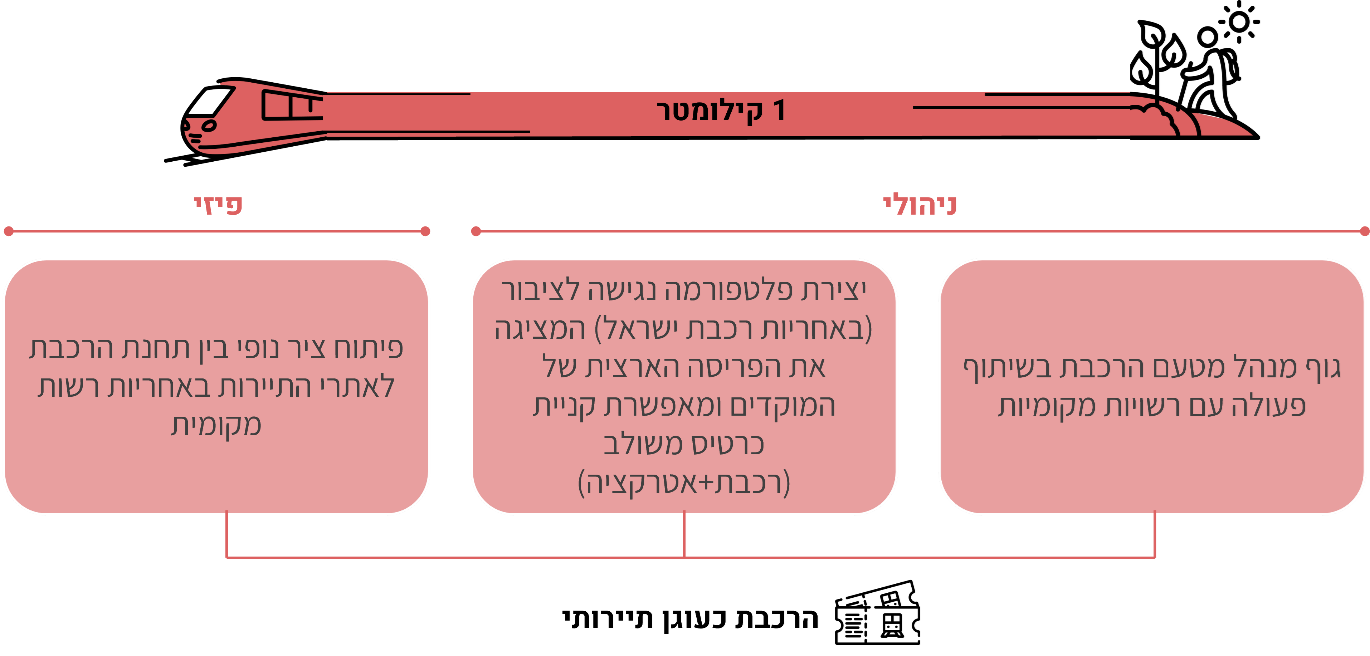 4. יצירת פלטפורמה – השלב האחרון בתהליך כולל את הקמתה של פלטפורמה דיגיטלית ארצית, בהובלת הגוף המנהל ובשיתוף אתר רכבת ישראל. פלטפורמה זו תשמש כלי מידע, ניווט ושיווק – ותציג את הפריסה הארצית של מוקדי התיירות הקשורים לתחנות הרכבת. בנוסף, היא תאפשר רכישת כרטיס משולב לתחבורה ציבורית ולאטרקציות. הפלטפורמה תהווה אמצעי משמעותי להנגשת המידע לציבור הרחב, תעודד תיירות פנים, ותחזק את תחנות הרכבת כשערים פעילים לעולם התרבות, הפנאי והטבע העירוני.