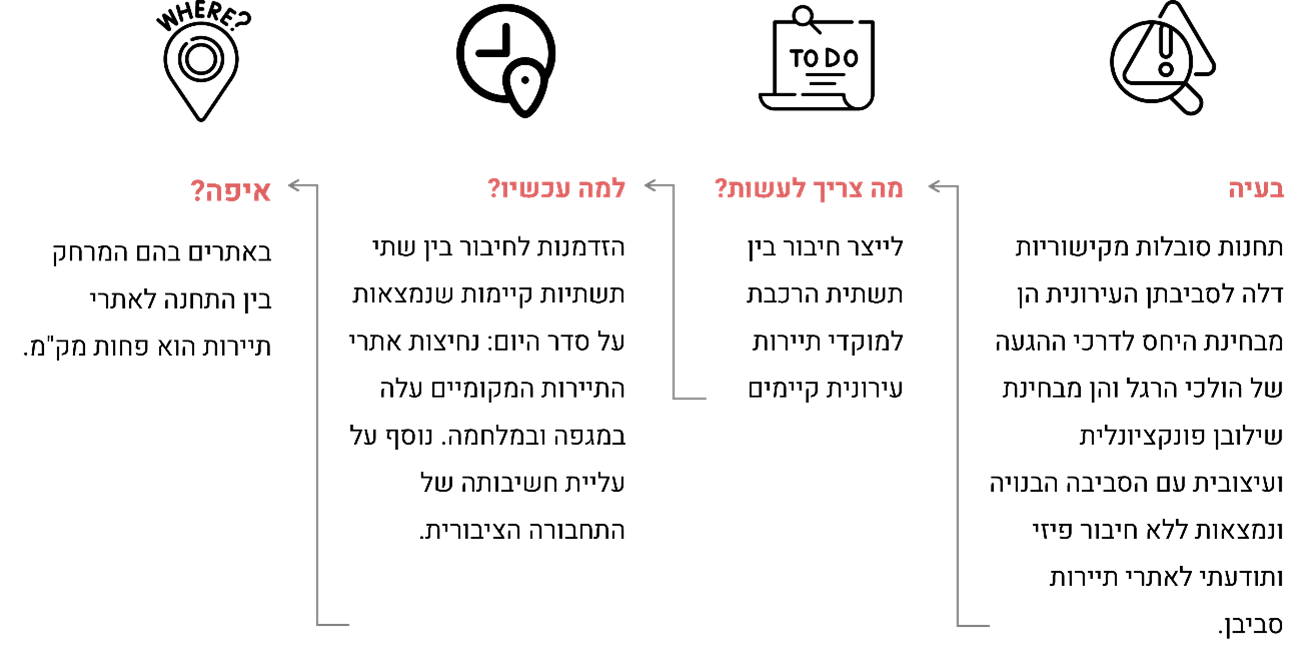 תחנות רכבת בישראל מתפקדות בעיקר כאתרי תשתית תחבורתית, תוך ניתוק מהמרחב העירוני הסובב אותן. התחנות מוקפות בחניונים, דרכים ראשיות ובתכנון הליכתי חסר. כתוצאה מכך, תחנות הרכבת אינן שערים עירוניים אלא איי תחבורה מנותקים, הפועלים בצורה אוטונומית בערים ובשכונות במקום להוות חלק אינטגרלי ומחולל בהן. מצב זה אינו גזירת גורל, הוא תוצאה של היעדר מדיניות אינטגרטיבית. ניתן וצריך להפוך את תחנות הרכבת למוקדים עירוניים, באמצעות חיבור בין שתי תשתיות קיימות: תחנות הרכבת ומוקדי תיירות עירוניים המצויים במרחק הליכה של עד קילומטר. כיום, תחנות רכבת רבות ממוקמות בסמיכות לאתרי תיירות עירוניים אך מנותקים. מצבים אלו, יוצרים נתק מהעיר, חווית משתמש חסרה והתעלמות מפוטנציאל כלכלי-תיירות עבור העיר. במקביל, מוקדי תיירות עירוניים מתפקדים פעמים רבות בחצר האחורית של התחנות ללא קישור או דרך הגעה נוחה. בכך הפוטנציאל לקשר נותר לא ממומש.