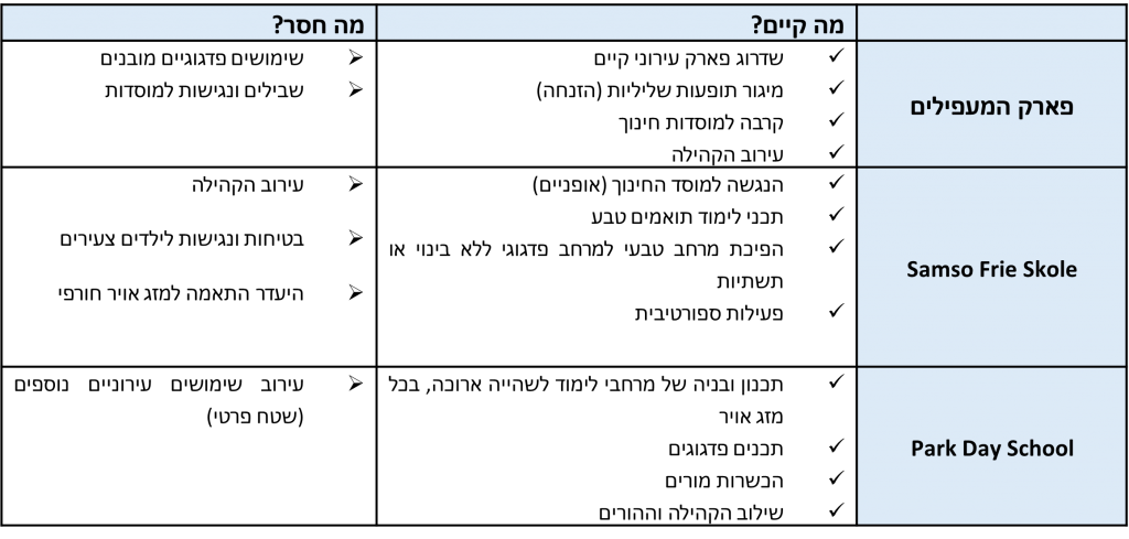 על מנת ליישם את סדר היום המוצע נבקש להתייחס לשלושה מקרי מבחן מרכזיים: פארק Day School באוקלנד, קליפורניה , פארק המעפילים בבאר שבע, ופארק Frie Skole בסאמסו, דנמרק (). שלושת המקרים הללו שונים מאוד האחד מהשני, אך יחד עם זאת, בכל אחד מהם ניתן למצוא אלמנטים ספציפיים בדבר האופן בו בוצעו הפרויקטים והפעולות שבוצעו במשאב עירוני קיים בכדי לשפר אותו לטובת הציבור, הקהילה והתלמידים.